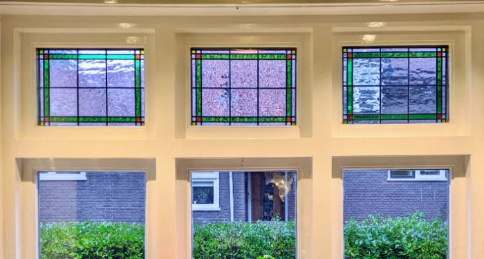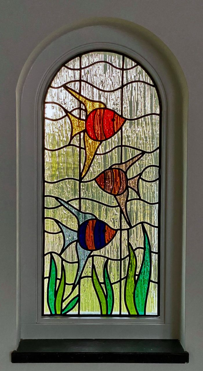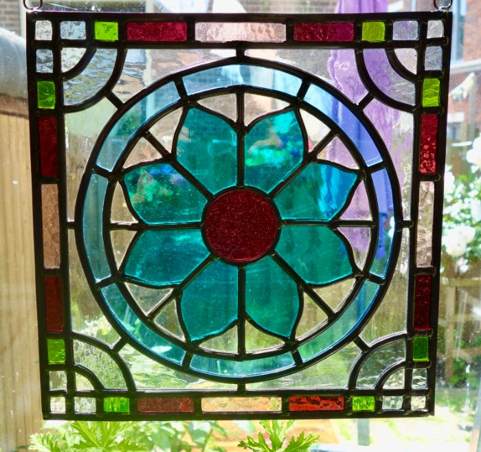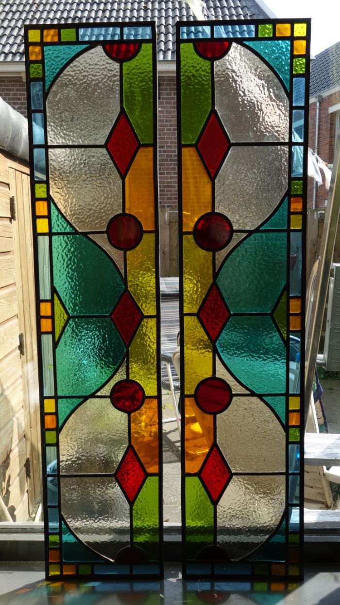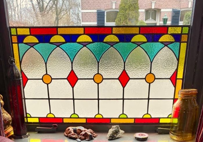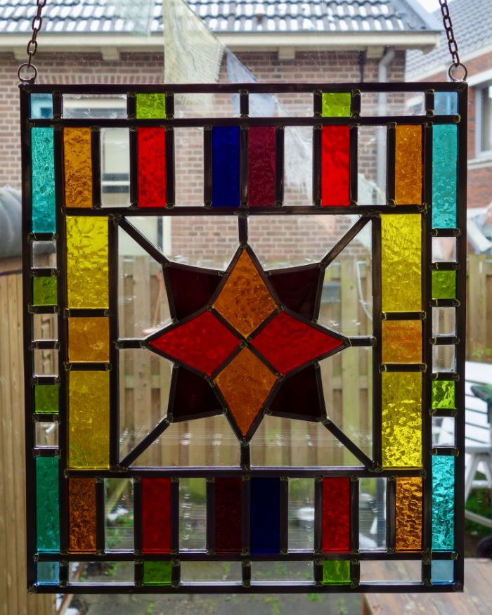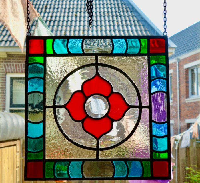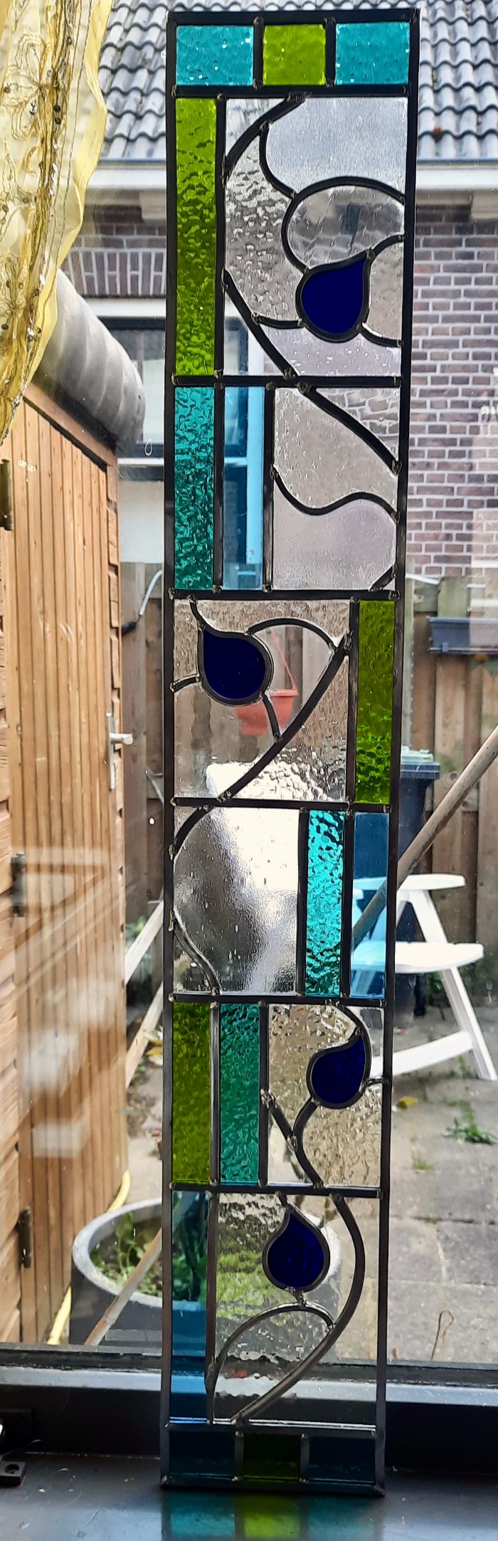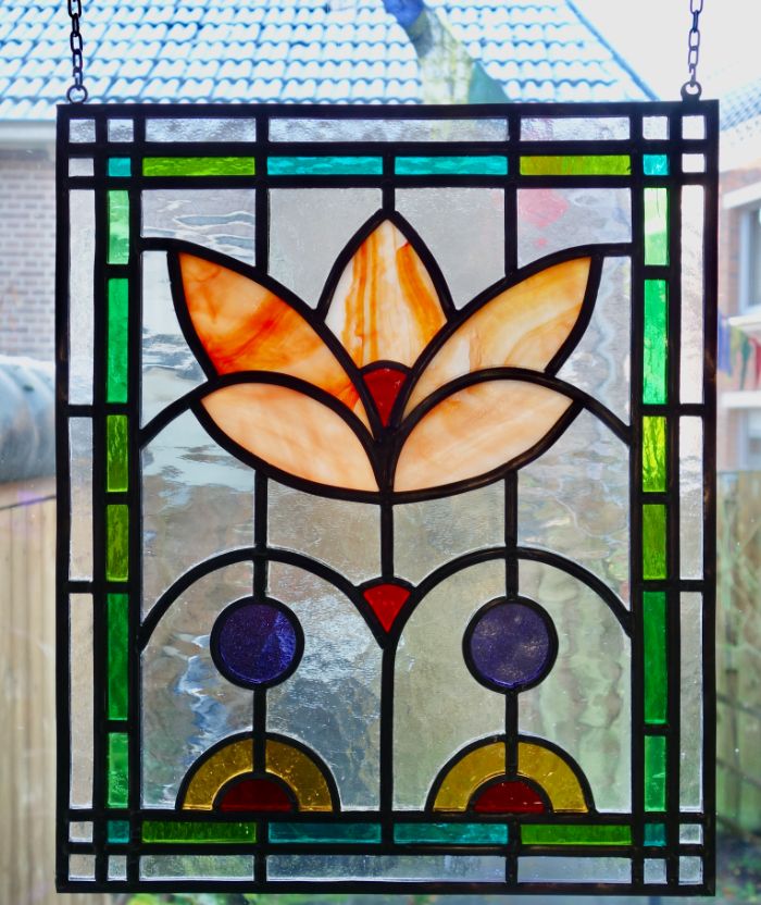 Een klassiek glas in lood ontwerp uitgevoerd in kleuren van deze tijd. Te gebruiken als raamzetter of hanger. Uitgevoerd in Corella Kathedraal glas, dus ideaal tegen inkijk. Dit paneel is 100 x 56 cm. en kost 500 euro.